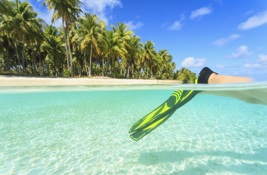 Наплаваяь с трубкой и маской под водой бирюзового цвета и устав, расположитесь на солнце на красивом белом песчаном пляже.
