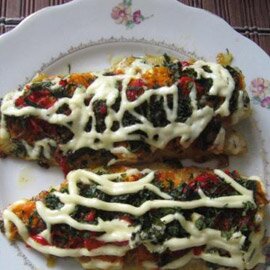 Продукты для жюльена из креветок : 200 г очищенных креветок, 100 г вареного риса, 100 г шпината или цветной капусты, 100 г шампиньонов, 1 луковица, соль по вкусу, 100 г сыра; для соуса – 1 столовая ложка муки, бульон креветочный, молоко, 1 яйцо.